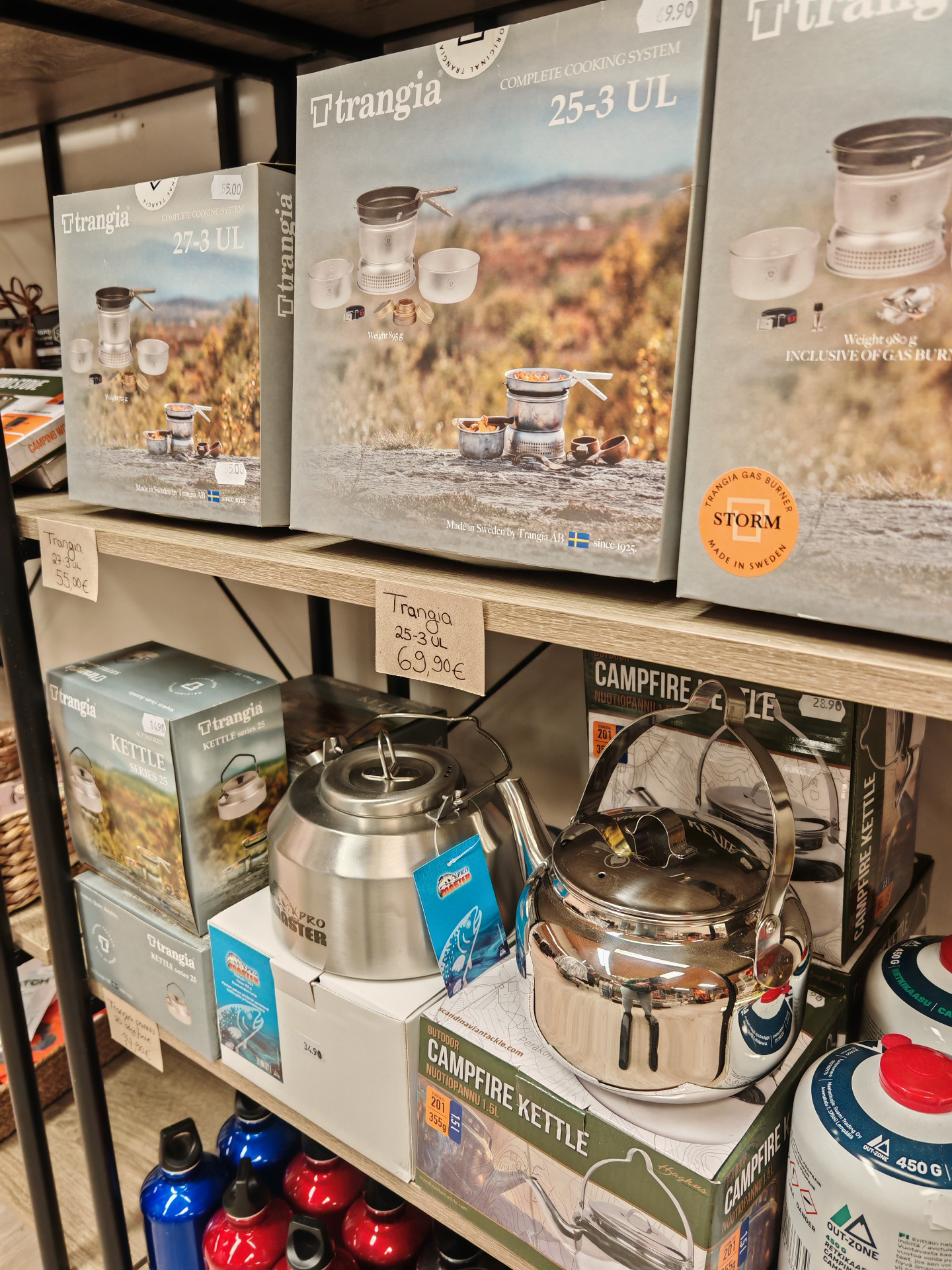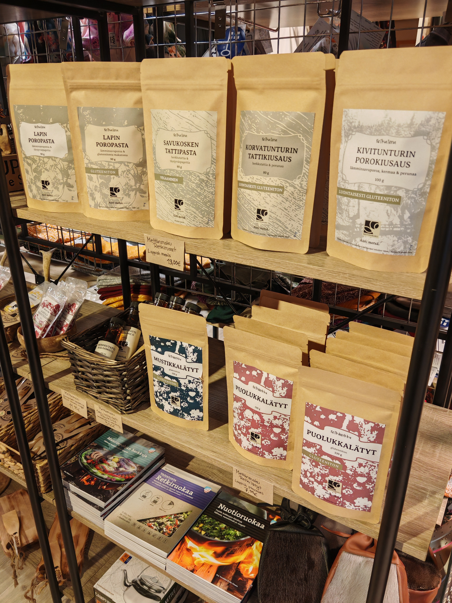 Retkeilypuolemme koostuu tarvikkeista ja vaatteista, joita tarvitset retkeilyyn ja ulkona liikkumiseen. Tutuimpia brändejä ovat mm. Trangia, Stanley, Real Turmat, Tatonka sekä Nikwax. Myös retkeilykategoriasta löytyy paikallista osaamista; nahkaiset kahvi-ja sokeripussit Pellosta, retkiruokia Savukoskelta sekä villapaidat Kolarista.